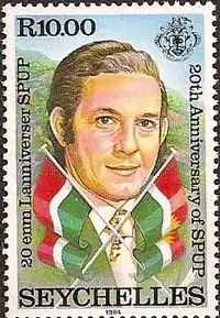 René's party, renamed the Seychelles People's Progressive Front (SPPF) in 1978, was the sole legal party from 1979 to 1991, largely financed from Tanzania, Algeria, Libya and the GDR. The newly reformed system of one-party socialism featured a directly elected president, as well as the original plurality system of legislative representation. All political activity took place under the rule of the Seychelles People's Progressive Front, and the President was voted for on a yes-no basis by any Seychelles citizen 17 or older. The President enjoyed almost unchecked executive power, and appointed his own cabinet as well as his own chair of the National Assembly. The legislature itself was unable to rule independently, and instead only enacted the bills proposed by the executive. Criticism of René or any aspect of his government was not tolerated. This[5] allowed him to be the only presidential candidate for elections in 1979, 1984, and 1989, which he won with over 90% of the vote. Multiparty democracy commenced around 1994, but René continued to win in 1993, and in 1998 and in 2001, when he defeated the opposition leader Wavel Ramkalawan, the candidate of Seychelles National Party.[6] In addition to presidency, he held several cabinet posts simultaneously including Minister of Foreign Affairs (1977-1979) and Minister of Finance (1981-1989), Minister of Finance and Industry (1984-1989), Minister of Planning and External Relations (1986–93), Minister of Interior and Defence, Minister of Industry (since 1998). In 1988 he added Tourism. The last addition was ironic, as he grudgingly acknowledged in private that he would be happier if no foreigners ever visited. In 1978-84 Chairman, and since June 1984 Secretary General of the SPPF.[7][8] In 1979, a planned invasion of Seychelles by supporters of Sir James Mancham with the assistance of American diplomatic staff in Kenya and Seychelles was discovered before it could be carried out. An official investigation also implicated France with involvement in the coup.