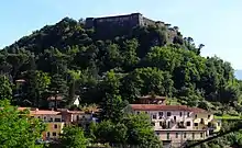 Traces of Roman and Etruscan civilizations found in the church of the Abbey of San Caprasio indicate that there were settlements in Aulla long before the 8th century CE, when margrave Adalbert I of Tuscany founded a village and built a castle to accommodate pilgrims traveling the via Francigena.[5] Here, at Aguilla Sigeric, Archbishop of Canterbury, sojourned on his return journey from Rome about 990.[6] The Malaspina family wrested feudal power of the city and its contada from the domination of the bishops and dukes of Luni. In 1543 the Centurione family purchased it. They built the Brunella Fortress, which was bought in the early 20th century by Aubrey and Lina Waterfield, and remains privately owned, functioning as a museum of natural history for the Lunigiana region. One of the most important buildings of the town is the Abbey of San Caprasio that was founded in the 9th century and named after Saint Caprasius of Lérins, whose body was transferred to Aulla in the 10th century.
