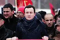 Albin Kurti first came to prominence in October 1997, as one of the leaders of the student protests in Kosovo. Albanian students protested against the occupation of the University of Pristina campus by the Yugoslav police. The occupation had started in 1991 and had led to ethnic Albanian academic staff and students having to use alternative locations for their classes due to them being barred from using university premises by Serbian law.[4] The protests were crushed violently, but the students and Kurti did not stop the resistance and they organized other protests in the following months. In July 1998, Kurti collaborated as assistant of the political representative Adem Demaçi, close to the UÇK group. These actions made him a target of the Yugoslav police.[2][5]