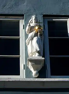 The building is four bays wide and has a balcony in front of the two central bays on the third floor. It features a Salvator Mundi sculpture between the two central windows on the first floor.