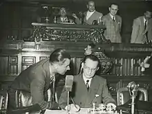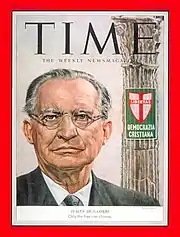 In 1954, De Gasperi also had to give up the leadership of the party,[18] when Amintore Fanfani was appointed new Secretary of the Christian Democracy in June.[19]