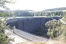 Alder Dam is a concrete thick arch dam on the Nisqually River in the U.S. state of Washington. The construction began in 1942 and was completed in 1945.[3] At this time Alder Dam was among the tallest dams in the United States, although this title has since been surpassed. The impounded water behind the dam forms Alder Lake, stretching about 7 miles (11 km) upstream with a capacity of 241,950 acre-feet (0.29844 km3). With 28 miles (45 km) of shoreline, the lake is a popular recreation spot close to Mount Rainier National Park.