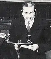 After being appointed vice-president of the DC, Moro was elected in the 1946 Italian general election a member of the Constituent Assembly of Italy, where he took part in the work to redact the Italian Constitution.[25] It was during this period that his relations with the Italian Socialist Democratic Party (PSDI) and Italian social-democrats began.[26] In 1946, Moro ran for the Bari–Foggia constituency, where he received nearly 28,000 votes.[27] In the 1948 Italian general election, he was elected with 63,000 votes to the newly formed Chamber of Deputies,[28] and was appointed Vice Minister of Foreign Affairs in the fifth De Gasperi government from 23 May 1948 to 27 January 1950.[29] After Dossetti's retirement in 1952, Moro founded, along with Antonio Segni, Emilio Colombo, and Mariano Rumor, the Democratic Initiative faction, which was led by his old friend Fanfani.[30]