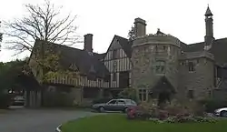In 1921, Higgins commissioned Grosvenor Atterbury to design a house modeled after the Compton Wynyates estate in England. It is an eclectic structure 2+1⁄2 stories in height, with its exterior finished in stucco, brick, and stone. It consists of two roughly rectangular wings, set at right angles to each other and joined by a central octagonal entry. The octagonal tower is crowned by a crenellated battlement. The upper levels are generally finished in half-timbered stucco, in some places decorated by additional foliate carvings. Many of its leaded casement windows are antiques shipped from Europe, and the house's Great Hall has architectural features removed from an Italian monastery. After the death of Mary Higgins, the house was donated to Worcester Polytechnic Institute in 1971, and now houses the Office of Alumni Relations.[3]