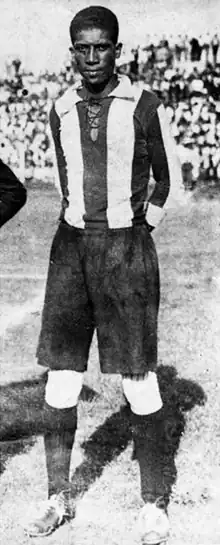 He is known to be Peru's historic bicycle kick figure. Alejandro Villanueva was noted to have an extraordinary handling the football, and his many outrageous moves won him the nickname "Manguera." Among his many exploits, the bicycle kick was one of the moves that won him widespread recognition. While playing for Alianza Lima, Villanueva's fame increased as he made international appearances such as in 1933 when Alianza Lima made a tour in Chile and, with fellow Peruvians such as Teodoro Fernandez, delighted the audiences with his skill and defeated a series of important Chilean clubs of that time such as Club Deportivo Magallanes, Santiago Wanderers, Audax Italiano, and Colo-Colo.[2][3] In Peru, Villanueva is often remembered as one of the finest exponents of that nation's association football and as the player that amazed the crowds with his bicycle kicks. The people of Lima at first thought the bicycle kick was his invention when he executed it in 1928, and commonly called it "tiro caracol." Later, the name changed to "chalaca" when people began to favor the idea that the move was invented in Callao several decades earlier.[4] As a result of these achievements, Villanueva remains a famous figure in Peru to the point that several songs have been made about him and his eternal club, Alianza Lima.