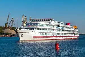The ship was built at Slovenské Lodenice in Komárno, Czechoslovakia in 1981 and was named after the 18th century Russian generalissimo Alexander Suvorov. Her length is 135.7 m, width 16.8 m, draft 2.9 m, and power 3 × 736 kW (2208). She has three engines and four decks. Her cruising speed is 26 km/h (16 mph; 14 kn), and her passenger capacity is 400.[7] During the 1980s Aleksandr Suvorov was a flagship of the Volga-Don Lines and was based at Rostov-on-Don.