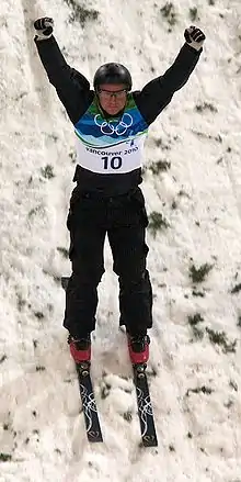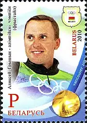 Aleksei Gennadyevich Grishin (Belarusian: Аляксей Генадзьевіч Грышын; Russian: Алексей Геннадьевич Гришин; born 18 June 1979) is a Belarusian freestyle skier who competed at five consecutive Olympics from 1998 to 2014. He won Belarus' only medal at the 2002 Winter Olympics, a bronze in aerials.[2][3] In 2010, he won the first ever Winter Olympics gold medal for his country, again in the aerials. He finished fourth in 2006 and eighth in 1998.[4] He was the Olympic flag bearer for Belarus at the opening ceremony of the 2014 Games.