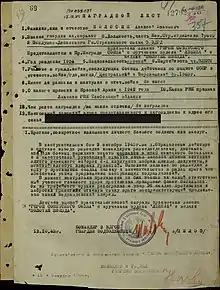 In the offensive battle for the village of Strakholesye on 2 October 1943, as a squad leader of a reconnaissance platoon moving ahead of the infantry, [he] burst into a German battalion headquarters and in a fierce hand-to-hand fight singlehandedly bayoneted a German major and two captains, retrieved valuable documents, and blew up a staff car with a grenade. Completing the reconnaissance mission in the enemy rear, he sowed panic and confusion in the enemy ranks, ensuring the success of the advancing units. When the enemy counterattacked, he was sent to the most critical section of the main blow of the enemy, covering the flank of the battalion. He shot 26 enemy soldiers at point blank range with a captured weapon and threw grenades at the enemy firing position impeding the advance of our units.[3]