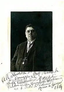 The Sistine Chapel Choir was run on traditional lines centuries old, and had a strict system of hierarchies. In 1886, the senior castrato, Giovanni Cesari, retired, and it was probably then that Moreschi took over as Direttore dei concertisti (Director of soloists).[11] In 1891 Moreschi took his turn as segretario puntatore, being responsible for the day-book of the choir's activities, and the following year was appointed maestro pro tempore, a largely administrative post concerned with calling choir meetings, fixing rehearsals, granting leave of absence and the like. During this year, Alessandro was also responsible for overseeing the choir's correct performance of its duties in the Sistine Chapel. Artistically speaking, the job involved him in choosing soloists and in developing repertoire. This entire period was one of great upheaval within the Sistine choir's organisation as well as Catholic church music at large: the reforming movement known as Cecilianism, which had originated in Germany, was beginning to have its influence felt in Rome. Its calls for the Church's music to return to the twin bases of Gregorian chant and the polyphony of Palestrina were a direct threat to both the repertoire and the practice of the Sistine Chapel. These were resisted by Mustafà, but time was against him. In 1898, he celebrated fifty years as a member of the Sistine, but also appointed Lorenzo Perosi as joint Perpetual Director. This 26-year-old priest from Tortona in Piedmont turned out to be a real thorn in Mustafà's side. Moreschi was very much a silent witness to the struggles between the forces of tradition and reform, but was also caught up in secular matters: on 9 August 1900, at the express request of the Italian royal family, he sang at the funeral of the recently assassinated king, Umberto I. This was all the more extraordinary because the Papacy still had no formal contact with the unified Italian secular state, which it regarded as a mere usurper.[12]