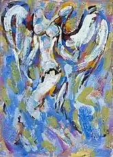 Alex Salaueu was an active participant in city, regional, republican and international exhibitions. Also his works were exhibited in Russia, the Baltic States, Germany, France and Australia. In 2010, the artist donated 35 of his works to the Vitebsk Art Museum, including abstract compositions and design sketches of decorations for the performances of the National Academic Drama Theater named after Yakub Kolas and pictorial canvases. Created for various theaters (including the Yakub Kolas National Academic Drama Theater), they allow one to get acquainted with the events of the post-war years through the prism of the author's perception, to trace the theatrical tendencies of that time. In addition, the artist gave the city paintings "Crucifixion", "Eve", "Requiem", "Old Fresco" and others.[4] The work of Alexander Solovyov became an integral part of the culture not only of Vitebsk, where the artist had a significant influence on the formation of the artistic environment of the city, but also the whole of Belarus in the second half of the 20th century. Work in the artist's studio did not stop until his death.[5] Alex Salaueu and Tony Zhuravel and are prominent representatives of the Vitebsk Art school founded by Marc Chagall and Kazimir Malevich .