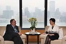 On 16 May 2007, with the support of the Greens, Salmond was elected by the Parliament to succeed Jack McConnell as First Minister of Scotland.[43] The following day he received the Royal Warrant from the Queen and was officially sworn into office at the Court of Session in Edinburgh.[44] Under section 45(7) of the Scotland Act 1998 he became Keeper of the Great Seal of Scotland at the same time.[45] He was appointed to the British Privy Council four weeks later.[46] Salmond became the first nationalist politician to hold the office of First Minister. He appointed Sturgeon as his Deputy First Minister.