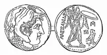 ![]() Illustration of silver tetradrachm of Ptolemy I of Egypt, in the name of Alexander the Great (ca. 310-305 BC). Obverse: youthful head, covered with the skin of elephant's head. Reverse: Pallas Athena, holding spear and shield; before her eagle on thunderbolt. | |