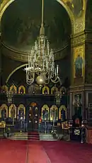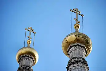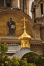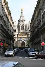 The Alexander Nevsky Cathedral (French: Cathédrale Saint-Alexandre-Nevsky, Russian: Собор Святого Александра Невского, romanized: Sobor Svyatogo Aleksandra Nyevskogo) is a Russian Orthodox cathedral church located at 12 rue Daru in the 8th arrondissement of Paris. It was established and consecrated in 1861, making it the first Russian Orthodox place of worship in France. It is the see of the Patriarchal Exarchate for Orthodox Parishes of Russian Tradition in Western Europe, recently transferred to the jurisdiction of the Patriarchate of Moscow.[2] It was built in part through a gift of 200,000 francs from Tsar Alexander II.[3] Alexander Nevsky Cathedral had not been aligned with the Patriarch of Moscow since the Russian Revolution. But as of 14 September 2019 the jurisdiction of the parish community of the cathedral was transferred to the Patriarchate of Moscow. The cathedral should not be confused with Holy Trinity Orthodox Cathedral, which is a provincial cathedral of the Patriarchal Exarchate in Western Europe (Moscow Patriarchate). The closest métro station is Courcelles