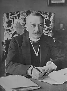 In November 1913 or May 1914, Protopopov was appointed as vice-president of the Imperial Duma under Mikhail Rodzianko, serving as Deputy Speaker from 1914 to 1916. Protopopov founded a newspaper Russkaya Volya ("The Will of Russia") which was financed by the banks and appointed Nikolay Gredeskul and Alexander Amfiteatrov as journalists.[3][4] According to Joseph T. Fuhrmann, Protopopov was hospitalized from the end of 1915 for six full months in the clinic of Peter Badmayev.[5] In Spring 1916, at the request of Rodzianko, Protopopov led a delegation of Duma members with Pavel Milyukov to strengthen the ties with the Entente powers, Russia's western allies in World War I.[6] Protopopov met with the German industrialist and politician Hugo Stinnes, the banker Fritz M. Warburg, and the Swedish Minister of Foreign Affairs Knut Wallenberg.[7] Protopopov faced a violently hostile reception from the pro-British Russian liberals upon his return from France and the United Kingdom, and in self-defence alleged that Warburg had initiated the talks.[8] Protopopov's secret contacts on peace and a swap between Russia and Germany became a scandal, which according to The New York Times was an indication of the rapprochement between the Russian and German Governments.[9] Protopopov was widely suspected of contacts with German diplomat Hellmuth Lucius von Stoedten.[10][11][12] In 1925, the Nazi journalist Theodor Fritsch rewrote the story, alleging Warburg had wrecked Imperial Germany, advanced the Communist cause, and changed the entire course of European history.[13]
