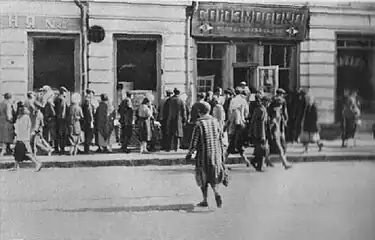 Living in Kharkiv, the then capital of the Ukrainian Soviet Socialist Republic, Wienerberger witnessed a massive famine, the Holodomor, and secretly took about 100 photographs of the scenes he saw on the streets of the city, despite the threat of arrest by the NKVD.[3] His photographs depict queues of hungry people at grocery stores, starving children, dead bodies lying on the ground, and mass graves of the victims of the Holodomor. Wienerberger created his photographs using the German Leica camera, which was probably transferred to him by friends from abroad.[2]