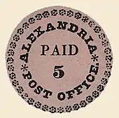 The Alexandria provisionals were produced under the auspices of the city's postmaster, Daniel Bryan. While just who supplied the stamps is undocumented, experts think it likely that they were fashioned with the equipment of a newspaper down the street from the post office, the Alexandria Gazette, published by Edgar Snowden.[2] The provisionals were printed in pairs from a typeset form that produced two not-quite-identical images, classified by philatelic experts as Type I and Type II. The Blue Boy is one of the four surviving Type I stamps; only three Type II examples are known. Both types conform to same general circular design, which presents an outer rim of rosettes surrounding a smaller ring of text: "ALEXANDRIA "* POST OFFICE. *"; and, at the stamp’s center, the horizontal word "PAID" with the numeral "5" below it. However, while Type I has forty rosettes, only thirty-nine appear on Type II—which, moreover, differs from Type I in its spacing of letters and asterisks. The provisionals' two-at-a-time production indicates that at least one Type II Blue Boy must have once existed.