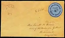 The Alexandria "Blue Boy" is a very rare stamp. It takes its name from the feature that makes it unique: its color. One of the few surviving stamps from a rare issue—the Postmaster's Provisionals produced in Alexandria, D.C., beginning in 1846, only seven of which are known—the Blue Boy is the sole example printed on blue paper (the others are on buff-colored paper).[2] Postally used, the Blue Boy remains affixed to its original envelope, which last sold in 2019 and still holds the record for the highest priced cover of United States philately.[3]