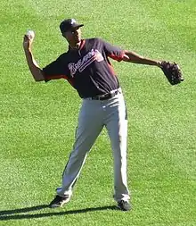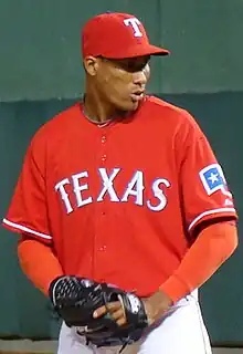 In the playoffs, Ogando was converted back to a reliever and won in game 1 of the 2011 ALCS against the Detroit Tigers.[19] Of Ogando's versatility as a starter and reliever, manager Ron Washington remarked, "what a weapon to have".[20] In game 7 of the 2011 World Series, Ogando relieved Mike Gonzalez, who was injured and left the game with a 3-2 count on the batter, Allen Craig, and recorded the strikeout.[21][22]