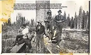 In the 1920s, with logging limited to the winter and fall seasons to facilitate the hauling of logs over snow and ice, loggers were transient. However, year-round work existed in sawmill towns such as Giscome, Aleza Lake, Hutton, Penny and Longworth.[423] Injuries and death were common in sawmills and logging camps. In 1922 at the Anthony mill, a piece of wood ejected by the edger, which embedded in the muscles of a worker's thigh, required surgical removal.[424] A 1922 fire totally destroyed the Aleza Lake mill, but the lumber in the yards was saved.[425][426] The following year, Mr. Klingaman from Edmonton acquired the Anthony mill,[410] and settled property tax arrears after the government seized company assets.[427] Hugh Blackburn and Percy Hasselfield, of Bannock, Saskatchewan, purchased the Aleza Lake mill site and timber.[428] Their private residences were south of the track near Miles 108.4 and 108.5 respectively.[66] Operating as the Northland Spruce Lumber Co., the company logged in the vicinity that winter and relocated their 40,000-foot capacity Bannock mill to the site in spring 1924.[429] The upgraded 50,000-foot capacity mill commenced cutting that summer.[430] A 1926 fire on the mill property destroyed the blacksmith shop.[431] Months later, Harvey Small Jr. slipped and drowned while manoeuvering logs on the lake.[245][432] Three years later, his parents faced further tragedy when their married daughter died from an illness.[433] Eight horse teams hauled logs along pole roads to the mill.[434]