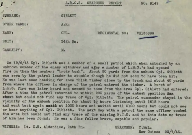 The Australian Red Cross "wounded and Missing" Searcher's Report (on Service File).