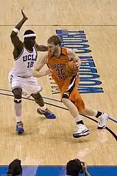 In his senior year in 2008–09, UCLA relied on him as a rebounder after Mbah a Moute and Kevin Love had left for the National Basketball Association (NBA).[3] Aboya averaged 9.9 points and 6.3 rebounds a game, both personal bests.[2][5] He drew praise for his defense, and also developed a 12-foot (3.7 m) jump shot.[6] Aboya and fellow senior teammates Darren Collison and Josh Shipp finished their careers as the winningest class in UCLA history with 123 wins.[7][8][9] The distinction was relative, as John Wooden's legendary teams played shorter seasons and freshmen were ineligible.[8]