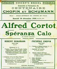 Alfred Denis Cortot[n 1] (core-TOE; 26 September 1877 – 15 June 1962) was a French pianist, conductor, and teacher who was one of the most renowned classical musicians of the 20th century. A pianist of massive repertory, he was especially valued for his poetic insight into Romantic piano works, particularly those of Chopin, Franck, Saint-Saëns and Schumann.[1][2] For Éditions Durand, he edited editions of almost all piano music by Chopin, Liszt and Schumann.[1]