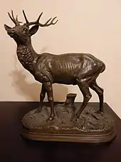 He modeled mainly animal groups, producing a number of deer, dog, and horse sculptures. His better casts feature a warm, mid-brown patination,[1] sometimes coming in even lighter shades bordering on a very light yellow, being nearly the color of the bronze metal itself. He frequently experimented with chemical patinas, learning the patination process from his teacher and mentor Barye who stretched the boundary with his now-famous dark green patinas.[3]