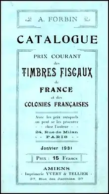 Forbin's Catalogue de Timbres-Fiscaux was the most comprehensive all-world catalogue of revenue stamps produced up to that time and is still regularly referred to by revenue philatelists as no other all-world catalogue has been prepared since Forbin's third edition in 1915. Forbin also started a journal Le Bulletin Fiscaliste in order to keep the catalogue up to date.[3]