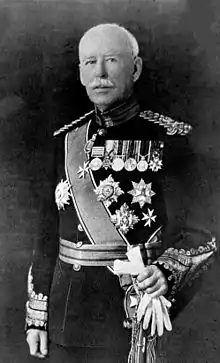 On 29 November 1900, he was appointed Companion of the Order of the Bath (CB) in recognition of services in the campaign in South Africa, 1899 to 1900.[11] On 7 May 1903, he was appointed a Knight of Grace of the Venerable Order of Saint John (KStJ).[12] He was promoted to Knight Commander of the Order of the Bath in the 1906 King's Birthday Honours.[13] On 24 July 1907, he was appointed Honorary Physician to the King (KHP).[14] He was promoted to Knight Grand Cross of the Order of the Bath (GCB) on 24 January 1917 'for services rendered in connection with [WWI]'.[15] He was appointed to the Order of the Companions of Honour (CH) on 25 February 1918 'for services in connection with the war'.[16] In the 1918 King's Birthday Honours, he was appointed Knight Grand Cross of the Royal Victorian Order (GCVO).[17]
