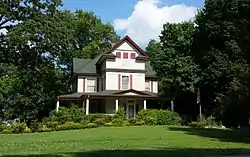 It is an imposing 2+1⁄2-story wood-framed residence, with a hip roof pierced by large gable projections, and a porch that wraps around three sides. Although the outside has the cleaner lines of the Colonial Revival, the building's interior is richly decorated with Queen Anne-style woodwork. The house was built in 1905 by Thomas Alfrey, a local builder, and was for many years home to a John Brown, a prominent local evangelist.[2]