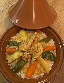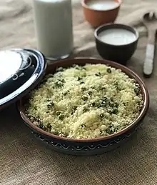 According to food historian Lucie Bolens, couscous has its roots in ancient times, specifically during the reign of Masinissa in the ancient kingdom of Numidia, located in present-day Algeria.[8] Traces of cooking vessels similar to couscoussiers have been discovered in graves dating back to the 3rd century BC, which belonged to the Berber kings of Numidia. These archaeological findings were unearthed in Tiaret and Kabylia, Algeria.[9][10] The Cirta Museum in Constantine, Algeria, preserves these historical utensils.[11]