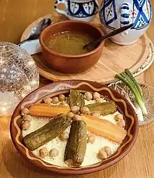 Mesfouf b'l-djelbana, a specific type of mesfouf that is made with green peas. - Kesksou m'ammer: Stuffed chicken couscous is a dish that typically consists of seasoned chicken breasts that are stuffed with a flavorful filling and then served alongside a bed of fluffy couscous. The filling can vary depending on the recipe, but it may include ingredients such as vegetables, cheese, nuts, or herbs.[34]
