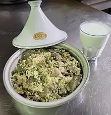 - Helhal couscous / Wild lavender couscous: The ingredient "Halhal" refers to wild lavender. the wild lavender is squeezed to extract its juice and essence, which is then used to moisten the couscous instead of water. The couscous is steamed twice and then olive oil is added at the end. It is served alongside buttermilk or milk.[43][44]