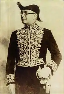 Ali Akbar Bahman was a member of the famous Bahmani-Qajar family. He was born in Tehran as Mirza Ali Akbar Khan in 1883, and died there in 1967. He descended from the family of Prince Bahman Mirza Qajar, son of Abbas Mirza. Bahman Mirza (1810-1884) was governor-general of Azerbaijan, and prince-regent for his ill brother Mohammad Shah and the infant crown prince Nasir al-Din. After Bahman Mirza fell out of favour at court he went into exile to the Russian Caucasus. His eldest son Prince Anoushiravan Mirza (1833-1899) returned to Iran, and had a daughter called Princess Malekeh Afagh Khanom (1863 - 26 October 1917), Ali Akbar Bahman's mother. His father was Mirza Hossein Behnam from an aristocratic family from Tabriz, which served the royal house since the days of Fath Ali Shah. Because of his father's early death in 1897 his mother married secondly Amanollah Khan entitled Zia' os-Soltan (lit. "Splendour of the Sovereign") from the Donboli family, her maternal cousin, who was a big landowner at Tabriz, and notable at court. His stepfather, a politician in the Iranian constitutional movement, encouraged young Ali Akbar in his career and introduced him to several political figures of that time like Yahya Dowlatabadi.[2][3] In 1931, when family names were mandated in Iran, Ali Akbar and his siblings Ali Asghar and Nosrat ol-Molouk Khanom named their family Bahman in honor of their grandfather Prince Bahman Mirza.[4][5]
