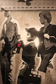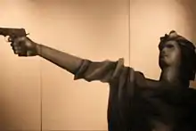 Ali Dirani's first solo exhibition, Front Row, confronts local affairs with no holds barred. The exhibition includes his airbrushed pieces like "Statut Social" and an adaptation of the statue on Martyrs' Square.[1] Dirani designed his adaptation statue with a gun in her hand, criticising the country's sense of national pride approach.[2]