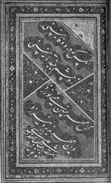 Ali Reza Abbasi Tabrizi was a prominent Persian[1] calligrapher and calligraphy teacher, who flourished in 16th-17th century Safavid Iran.[2] He was titled by Abbas I as Šāhnavāz Xān. Abbasi was a master of Naskh and Thuluth scripts and the initiator of his own style of Nastaʿlīq script. Besides he was an expert of various other scripts like Muhaqqaq, Reqa, Reyhan, Tevki and Taʿlīq scripts.[3]