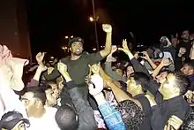 In February 2011, large-scale pro-democracy protests began in Bahrain as part of the international Arab Spring. The center of the protests was Pearl Roundabout in Manama, which protesters compared to Tahrir Square in the recent Egyptian revolution.[3] The roundabout saw several battles between protesters and police, including a 17 February pre-dawn raid that killed four protesters[4] and injured one hundred more.[2] After seeing the violence, al-Ghanmi left his guard post and joined the crowd, announcing to them that he could no longer support "a killer institution".[2] The crowd hoisted him on their shoulders, and al-Ghanmi became an immediate "mini-celebrity" of the protest movement.[5]