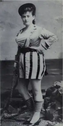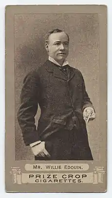 William Frederick Bryer (1846-1908), who went by the stage name of Willie Edouin[12] began a notable association with Lydia Thompson, playing with her burlesque troupe at Wood's Museum, New York, in October and November 1870. In the company was a sixteen-year-old Atherton.[13] Three years later she married her English co-performer, Willie, on December 27, 1873, in St Louis.[14] Together they became mainstays of the Coville burlesque companies. He organized the entertainment "Dreams, or Fun in the Photograph Gallery," a piece that showed off her skill for impersonation and popularized the comic skit as a stage form.[15][16]