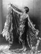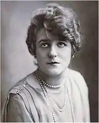 The censor, the Lord Chamberlain, hastened to see the show, and demanded changes.[11] After an uncertain start, the revue was a huge success; the song "We don't want to lose you, but we think you ought to go", encouraging young men to join the army, was a particular hit for Delysia.[7] Within weeks the other items in the triple bill were dropped, and Odds and Ends was expanded to a full evening, with only a brief curtain raiser.[12] Within two months of the opening, Delysia was an established star, invited to take part with Muriel Foster, Charles Hawtrey, Oscar Asche and Isidore de Lara in a charity matinée attended by Queen Alexandra.[13] It was the first of many charity appearances that Delysia made during the war. Her biographer Anne Pimlott Baker writes that Delysia entertained wounded troops, and took many French refugees and orphans into her home.[4] In 1916, she made her film début, and took a leading role in SHE, an adaptation of the Rider Haggard story, about a woman's passion for a young traveller.[14]