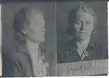 After the 1940 Soviet invasion and occupation of Estonia during World War II, Kuperjanov, like all other leaders of Estonian political organisations, came to the immediate attention of the Stalinist regime's secret police, the NKVD. On 14 June 1941, she was arrested at her home, and a few weeks later deported to a Soviet prison camp in the Ural Mountains in Sosva, Sverdlovsk Oblast.[3] She was accused of belonging to the "counter-revolutionary" Defence League in 1925–1940 and of having been the wife of a "White partisan commander" fighting against the Soviet Red Army in 1918–1919. She was sentenced to death by shooting and confiscation of all property. Alice Kuperjanov was executed on 17 July 1942.[1][4]