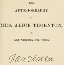 - ↑ Thornton, Alice (1 May 2014). Anselment, Raymond A (ed.). My First Booke of My Life. UNP – Nebraska. doi:10.2307/j.ctt1d9njz8. ISBN 9780803254299.
