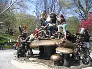 The statue was created in 1959 by José de Creeft under the commission of George Delacorte, so children could experience Alice in Wonderland in person. The sculpture was originally cast at the Long Island Modern Art Foundry in the Steinway Mansion.[2] The sculpture is unique because visitors are encouraged to interact with the statue. The statue is made of bronze and was derived from images John Tenniel created for the original publication. The face of Alice is actually based off Creeft's daughter, Donna.[1] The sculpture's Mad Hatter is a caricature of George Delacorte.[3]