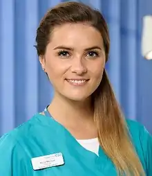 Alicia is billed as "bright and bubbly" and Halfpenny said that "she's got blonde and pink hair, so people expect her to be a bit ditzy, but she's not."[9] She called Alicia "a bit of a try-hard" because she tries to impress everyone,[9] making her appear naive.[3] She added that Alicia was "a young and kind person".[6] Alicia is a "typical junior doctor" and very talented at her job which shows when she starts working. A BBC Online reporter described her as "effortlessly brilliant and passionate about her chosen subject – medicine".[8] She is a positive person and "a joy to have in the department".[8] Halfpenny was highly publicised for playing Amy Wyatt in the British soap opera Emmerdale, and she contrasted Alicia's characteristics with that of Amy, stating that whilst Amy "lied quite a lot", Alicia is "very happy-go-lucky".[6] She said she also preferred smiling to being miserable, which Amy was known for being.[3] Halfpenny reflected on Alicia's characterisation in 2018, noting that Alicia joined the show as "a naïve girl" who struggled with serious injuries and found herself getting over involved in patients' lives, but over the course of her time on drama, Alicia has become more "professional".[10]