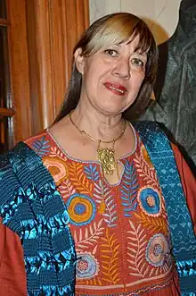 She often works with natural materials such as stone, sand, vegetable pigments.[2] She states that she believes in God, but as an “essence” which exists in all parts of the universe. For this reason, she creates altars as artistic works such as “Altar a la madre tierra” which uses river stones as well as stones from the Tajin pyramid .[7] There are Mexican indigenous influences in her work, especially her textiles which are inspired by traditional Mexican embroidery.[4] Her 2011 exhibition, lak'ech, a lak'en (I am your other you, you are my other me), included altars, drawings and paintings done with natural paints and stone, using Mayan cosmology.[6] Art critic Bertha Taracena states that her recent work, “shows her conviction that pre Hispanic traditions and their magical splendor have relevance today.[8]