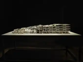 Ruttan returned to human affairs in 2011 to consider war and its effects on communities. Inspired by Han Dynasty funerary models, she chose to work in ceramics for its physicality, intimacy, and ability to break through the desensitization of media images to facilitate empathy.[1][46][17] Her series, "A Bad Idea Seems Good Again" (2011–6), consists of approximately 30 small-scale, ceramic maquettes of devastated buildings based on photographs of war-torn Beirut.[47][18] (The "Dark City" series of 2016–7 focused on destruction in Aleppo and Homs, Syria.)[48] Critics and curators described them, variously, as uncanny, disorienting, "eerily beautiful, and graphic in their depiction,"[49] noting how Ruttan's material and formal choices complicated the work's reception.[3][18][1] In a jarring mix of aesthetics, memorial and documentation, the sculptures juxtapose familiar International Style architectural grids and objet d'art scale and beauty against the reality of rubble, collapse and (undepicted) death.[18][3][47][1] Ruttan's decisions to leave some of the buildings intact on one side—thus portraying the transition and path from whole to collapse—and to place others on low tables organized like city-block grids had a similar effect, positioning viewers to embody time and destruction as they moved around the work.[18][1] Critics linked the uncomfortable, God's-eye view to a distanced, perhaps American perspective, interpreting the works overall as a reflection on the failures of modernism, reason, and basic empathy.[46][18][44]