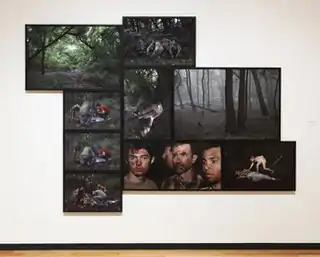 Ruttan's research eventually took her to the work of primatologist Jane Goodall.[41][42] She was fascinated by the account of an unexplained, deadly civil war within a once-peaceable chimpanzee troupe, seeing in it an "origin story" of humanity's own history of warfare.[17][1][43] Ruttan's inquiry and previous work led to the epic series, The Four Year War at Gombe (2009–12), seventy-five photographs and three videos in which she choreographed and filmed a reenactment of the primate war using family, friends and neighbors.[44][1][26] The series contrasts pastoral scenes of the intact community that she modeled after Corot plein air paintings and images of 1960s American communal life with tableau of the murders (e.g., the installation, Honey Bee Watches the End Come for Willy Wally) which reference films such as Deliverance, West Side Story and Lord of the Flies.[45][15] Art historian Lisa Wainwright described it as "wonderfully bizarre—primitivism gone amuck in a richly verdant setting."[1] Interpretations varied; many critics saw a dark, Biblical or Shakespearean meditation on humanity's perhaps genetic propensity for violence, tribalism and instinctive action.[26][45] Others detected subtle hope in the disjuncture between the human reenactment and the original primate behaviors.[44][18][41] Michael Weinstein wrote that the series evoked "a mixture of humor, absurdity, depression, truth and self-recognition."[45]