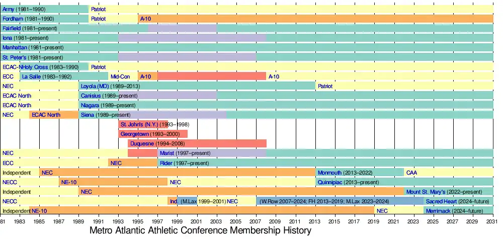 The conference was founded in 1980 by six charter members: the U.S. Military Academy, Fairfield University, Fordham University, Iona College, Manhattan College, and Saint Peter's College.[1] Competition officially began the next year, in the sports of men's cross-country and men's soccer.[1]