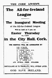 Regarding himself as having been driven from the party by Hibernian hooligans,[8] O'Brien's subsequent move was to officially constitute his new movement, the "All-for-Ireland League", its embryonic origins – the successful Land Conference of 1902, which he launched at a public rally in Kanturk[14] in March 1909. It was immediately openly denounced by Redmond, and at an Irish party meeting held on 23 March, the party voted fifty to one that membership in the League was incompatible with party membership.[15] O'Brien suffered a health breakdown in April, and retired from politics to Italy to recuperate. Control of the fledgling AFIL passed to a Provisional Committee led by D. D. Sheehan (MP) as Honorary Secretary, its foremost task to promote the League's principles and to hold O'Brien's seat in Cork at the inevitable by-election until his return.