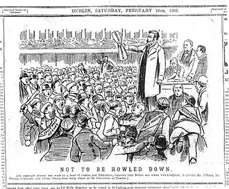 When he attempted to speak O'Brien was howled down by various contingents of Belfast Hibernians and midland cattle-drivers, their presence pre-organised by Devlin's AOH organisation. Its stewards, armed with batons, attacked O'Brien's follower who had gained entrance, their general order to "Let no one with a 'Cork accent' get near the platform". From which the event earned the name Baton Convention.[11] When Eugene Crean MP for South East Cork was attacked on the platform, it developed into a mêlée with Devlin and his lodgemen, after D. D. Sheehan and James Gilhooly, MP for West Cork, intervened against Crean's assailants,[12] this in Redmond's presence. Others targeted were members of the Young Ireland Branch, Frank Cruise O'Brien and Francis Sheehy-Skeffington, who called Devlin a brainless bludgeoner.[13]