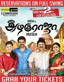 All in All Azhagu Raja (transl. All in All Handsome King) is a 2013 Indian Tamil-language romantic comedy film[1] written and directed by M. Rajesh. The film stars Karthi in dual lead roles with Kajal Aggarwal, Prabhu, Santhanam, Saranya Ponvannan, and Radhika Apte in the supporting roles. The music was composed by S. Thaman with cinematography by Sakthi Saravanan and editing by Vivek Harshan. The film was released on 2 November 2013 (coinciding with Diwali) to negative reviews from critics.[2]